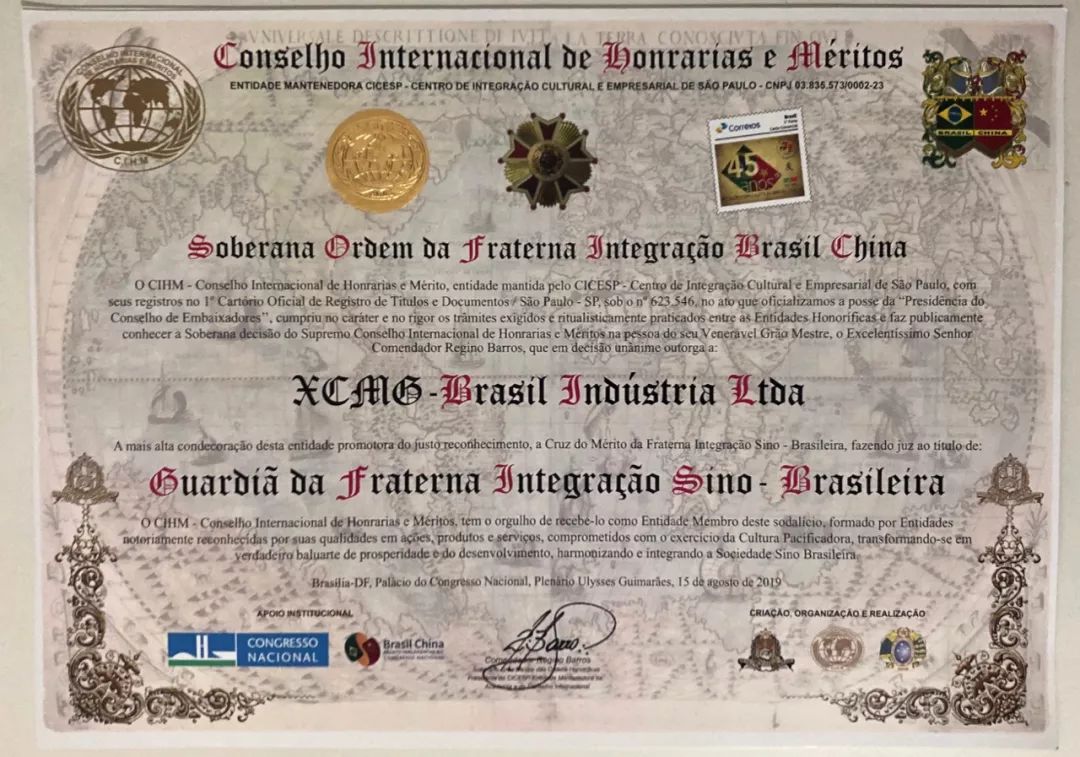 徐工巴西荣获“中巴交流最高荣誉勋章”和证书