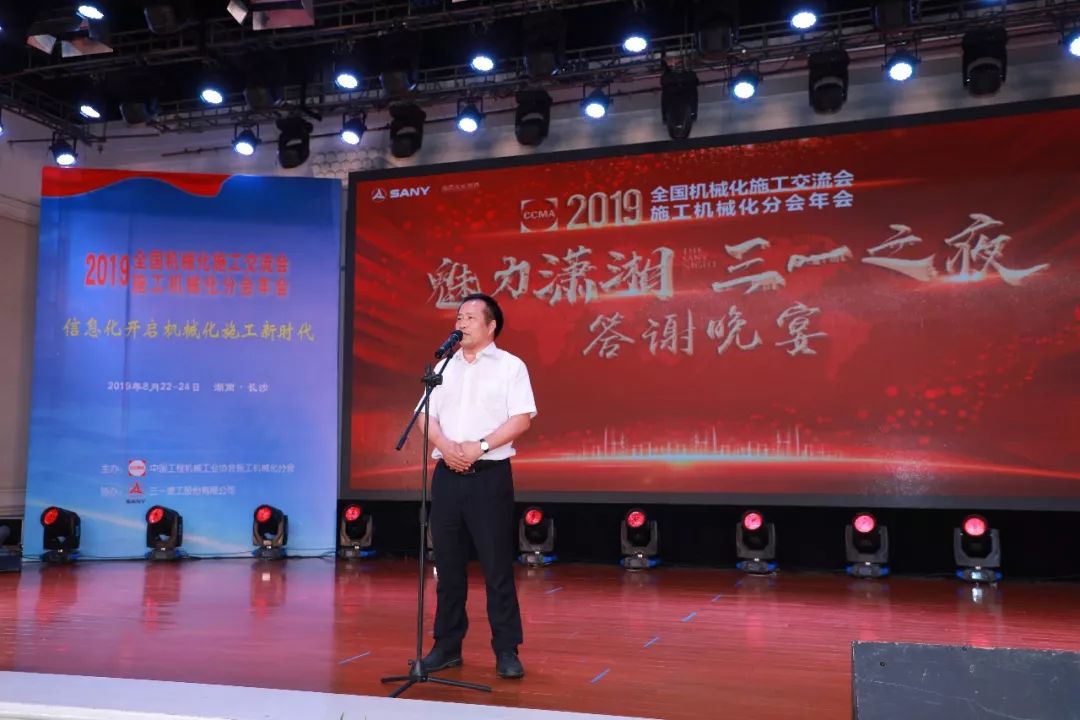 晚间,“魅力潇湘·三一之夜”——2019年施工机械化分会年会暨全国机械化施工交流会答谢晚宴在明城国际大酒店金色大厅举行。晚宴伊始,激情澎湃的开场舞《领航新时代》将现场气氛瞬间点燃。随后,三一重工副总经理兼泵送研究院院长易秀明先生上台致祝酒词并揭开晚宴活动序幕。