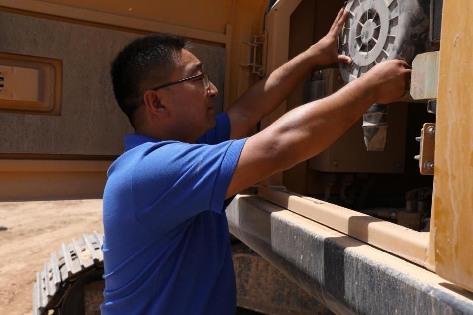 三四点钟的太阳依旧毒辣。机器被晒得滚烫,服务人员赤手上阵,认真检查每一个细节,连串的汗珠顺着他们的脸颊滴落在干枯的地面,“滋”一声没了踪影。“全心守护·终生无忧”不怕苦、不怕累的徐工人用极致的服务回报着客户的信任。