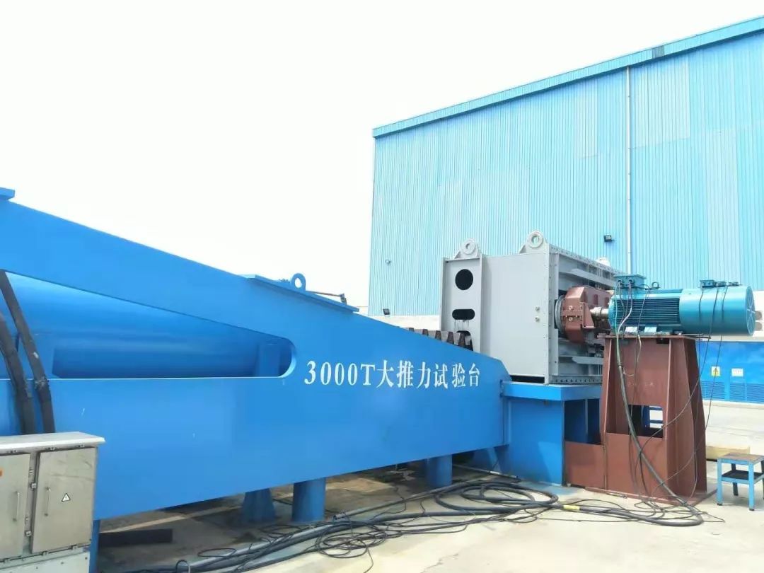 3000吨大推力试验台是振华重工研制的专业测试设备,可进行海上石油平台和特种工程船用升降系统、锁紧系统和齿条等重载测试。试验台除了具备实时记录和显示测试时液压信号、电气信号和测量信号等相关数据功能,还具备多角度的同步视频监控和记录功能,定向声音的同步监听和记录功能。