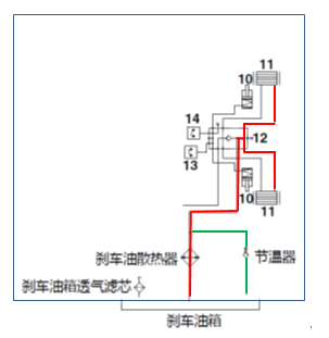 正面吊前桥轮边刹车系统工作时产生热量,依靠刹车油泵将刹车油通过充压阀输送到前桥进行轮边冷却。冷却后的回油经过刹车油散热器回到刹车油箱,回油温度较低时,节温器打开。冷却回油由于通过散热器时有阻力,会直接快速地通过节温器回到刹车油箱。