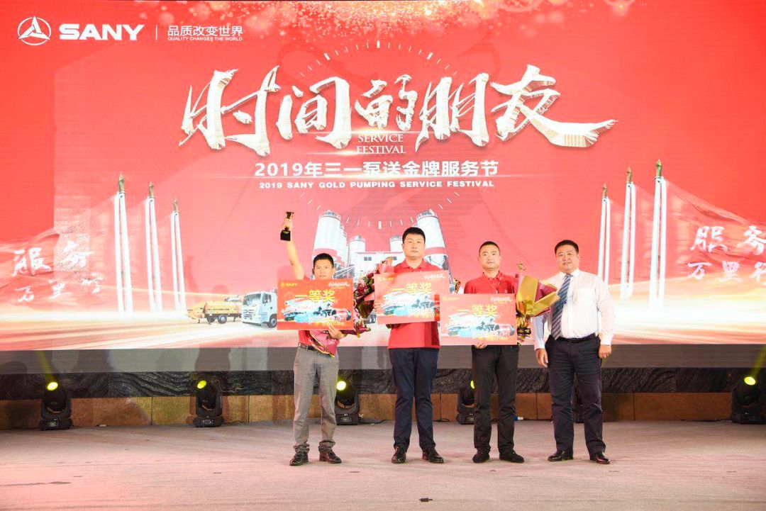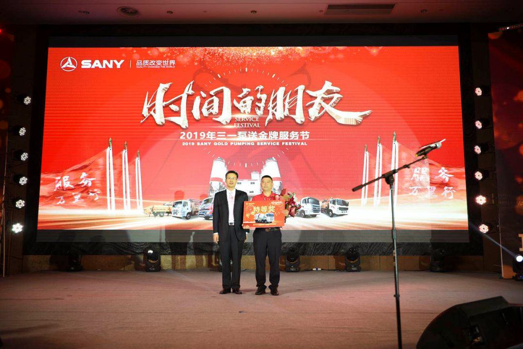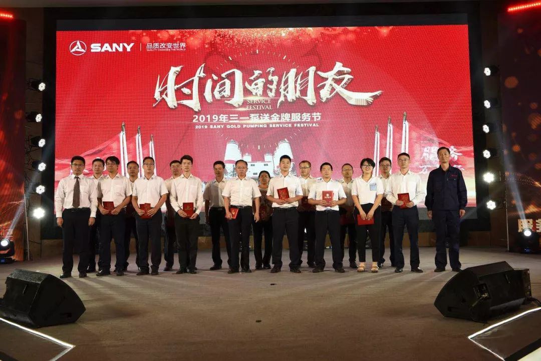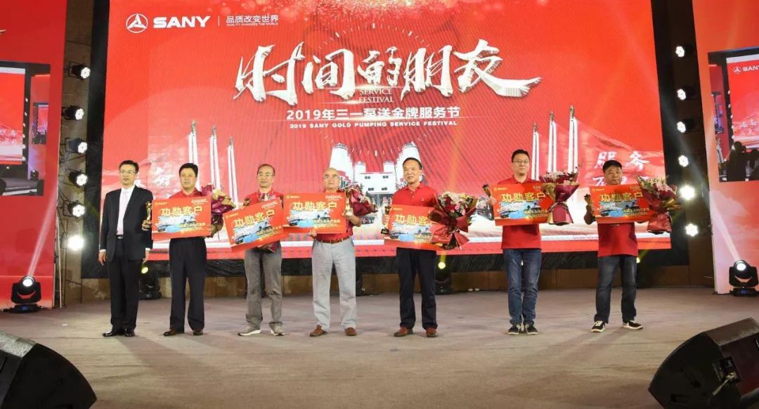 活动现场,2019年“时间的朋友”-三一泵送金牌服务节功勋设备及功勋客户线上评选结果荣耀揭晓。在鲜花与奖杯簇拥下,受奖客户与三一领导合影留念,记录下这一荣耀时刻。