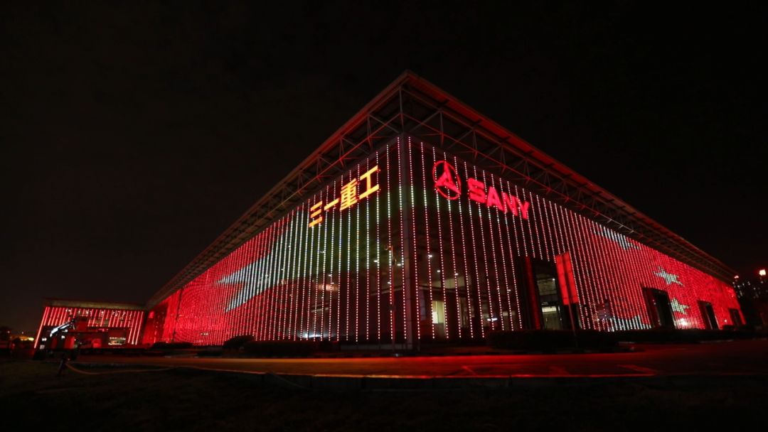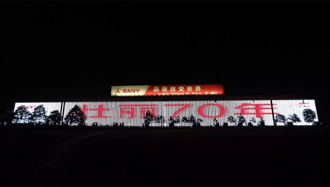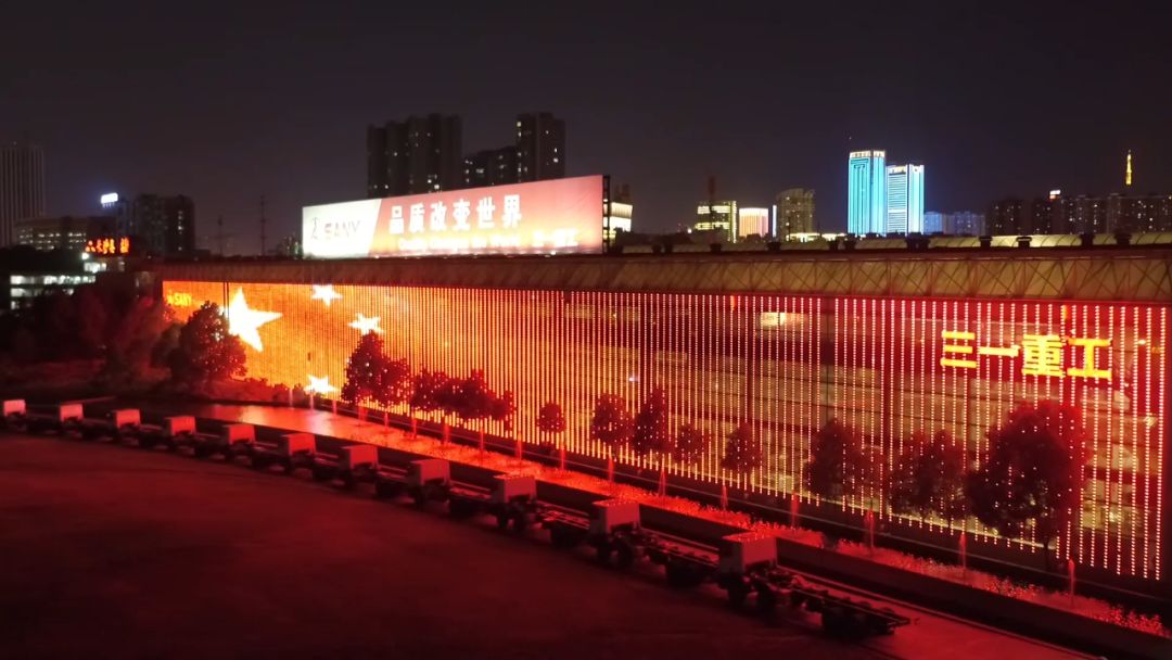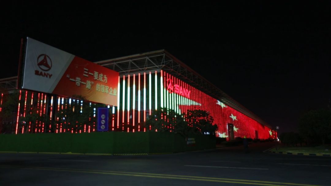 9月25日早5点,嘹亮的国歌声中,一面长约3.6公里、总面积近40000平方米的巨大“五星红旗”形象,在全亚洲最大的三一重工18号厂房外屏上升起。