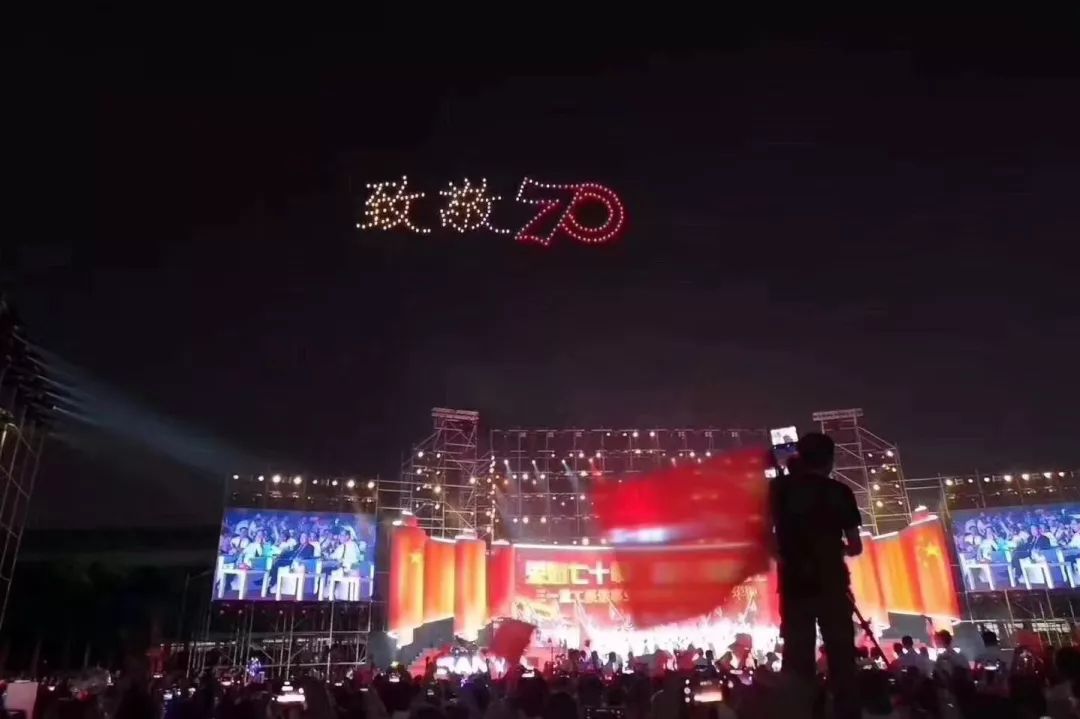 当晚,从地面到天空立体式表演的泵送事业部带来了最大的惊喜。载歌载舞的演唱中,无人机在舞台上空组成了“我爱你中国”的文字,现场无数人举起手机拍下了这梦幻的一刻。