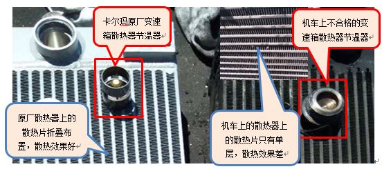 根据以上检查结果,可以判断变速箱油散热器是影响变速箱油温高的问题所在。仔细检查变速箱散热器,发现散热器上的节温器与原车匹配的节温器功能不一样,且散热器上的散热片较少,散热效果不理想。