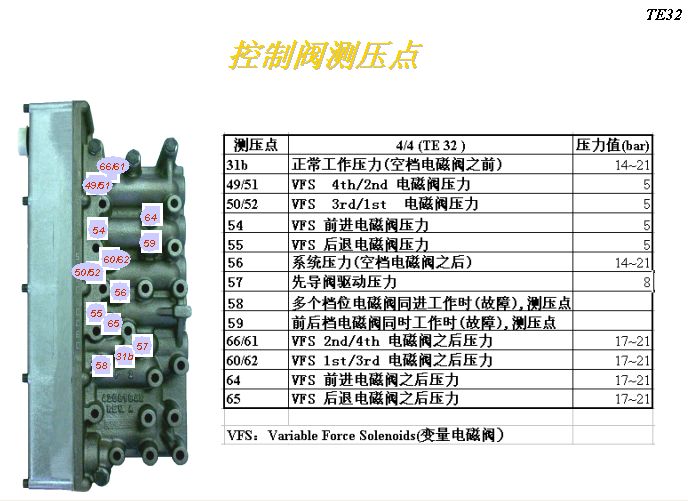 在高温报警时,再次用红外测温仪检查散热器,进油管温度为95ºC,回油管温度为92ºC,散热器表面约为93ºC,以上测量数据可以推断故障原因可能有三个:1、变速箱油散热系统没有起到散热作用; 2、变速箱控制阀故障或内部档毂打滑产生额外热量导致油温过高;3、变矩器工作不正常造成变速箱油温高; 首先检查变速箱控制阀和档毂是否存在异常。熄火断电后检查变速箱阀组至控制器之间线束正常,无短路或断路现象,检测各比例电磁阀线圈阻值约4.5欧姆,选择电磁阀线圈阻值27欧姆,压力传感器阻值约2200欧姆,电气系统检查未见异常。然后外接压力表至变速箱控制阀,根据控制阀测压点分布图(如下),在机车运行时依次测量变速箱前进挡(64)、后退档(65)、1/3档(60/62)、2/4档(66/61)电磁阀后压力,压力值均保持在22bar。而且该压力值与变速箱壳体上测得的各档毂压力值相同,说明变速箱档毂运行状况良好,不存在泄压打滑的问题。多个档毂同时工作的故障检查点(58/59)也没有检测到压力。根据以上检测结果表明变速箱阀组、内部档毂运行正常。