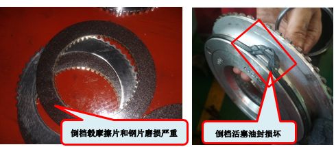 将变速箱油排出到干净的油桶,发现放出的变速箱油上有很多黑色的粉末,可以判断变速箱内部档毂磨损。 进一步吊下变速箱,拆解后发现倒档毂内磨擦片磨损严重,间隙过大,倒档活塞都脱出,活塞油封损坏。