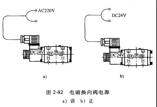 电磁线圈断路或短路,前者电磁线圈不产生磁力,后者电磁线圈即使能产生磁力,若不足以克服换向阀的阻力时,换向阀也不会工作。电磁阀线圈烧坏,可拆下电磁阀的接线,用万用表测量,如果开路,则电磁阀线圈烧坏。线圈受潮会引起绝缘不好而漏磁,造成线圈内电流过大而烧毁,因此要防止雨水进入电磁阀。此外,弹簧过硬,反作用力过大,线圈匝数太少,吸力不够也可使得线圈烧毁。