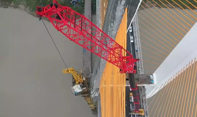 现场,设备方与施工方经过多次调整作业策略,在确保不会与桥梁发生接触的情况下,决定采用主臂84m+副臂12m的组合工况,起升位置超越了151米的高塔,解决了作业最大的角度的问题,保证了此次作业的安全性。在各岗位的紧密协作下,塔吊大臂一截接着一截平稳到达地面,在一天内圆满完成任务,SAC4500T首吊开门红,高效的作业能力让现场的所有人都倍感惊喜。
