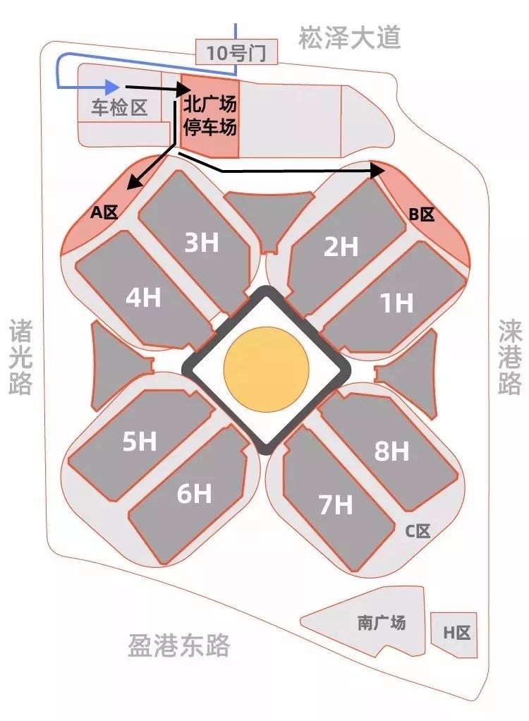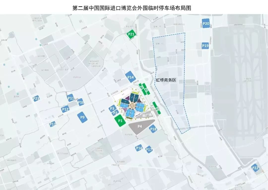 温馨提示:停放于P1-4、P14、P18等近端停车场的车辆,观众下车后自行步行至就近入口入场;停放于其余远端临时停车场和虹桥商务区停车场的车辆,观众下车后可乘坐停车场接驳线接驳至进博会P5、P8 停车场,开行时间8:00-20:00,发车间隔10分钟,客满即发,下车后经东侧二层步廊到达东厅入场。