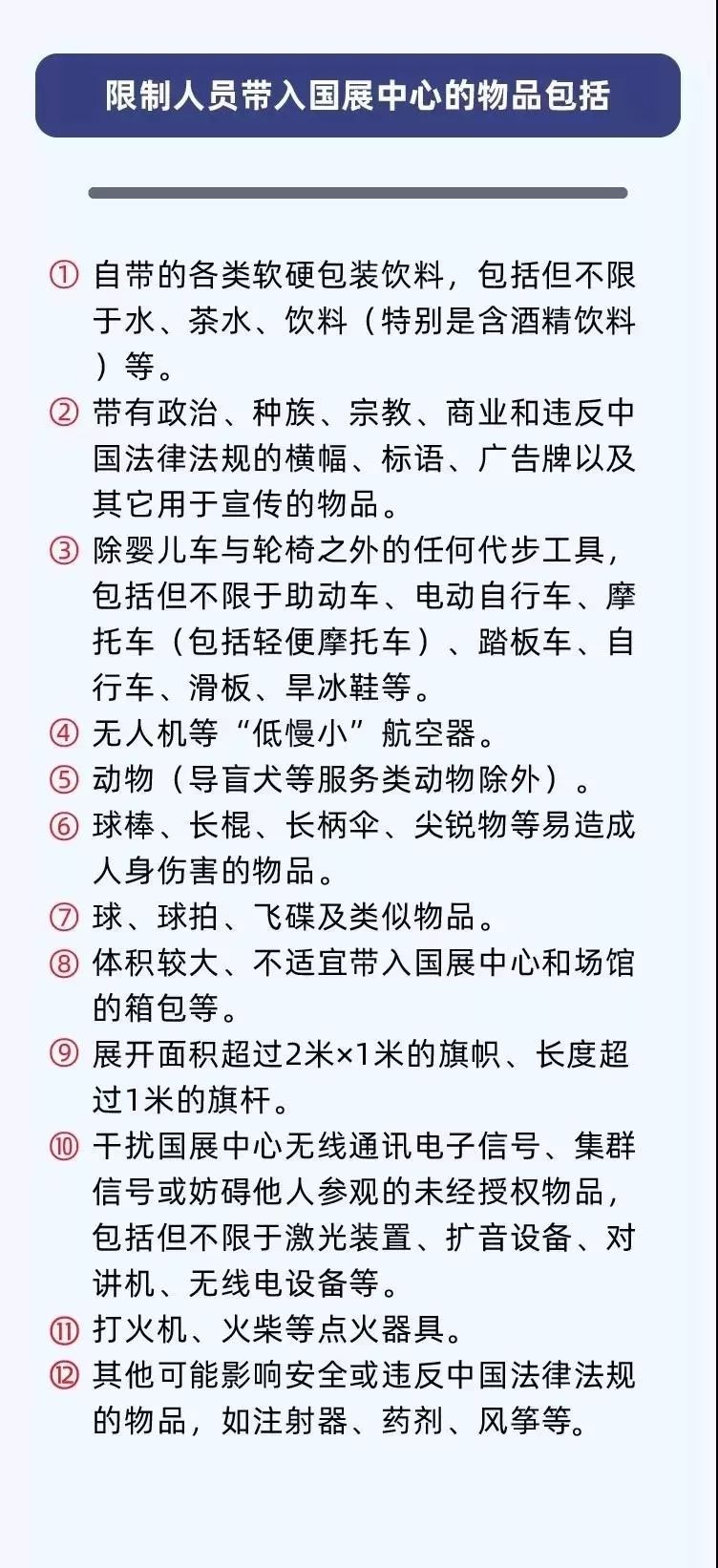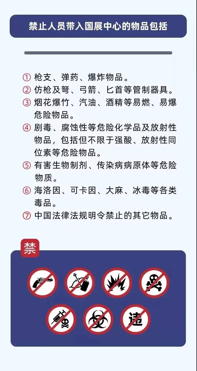为保证展会安全平稳开展,展会期间,国家会展中心共设置了19个安检点。为了能顺顺利利逛展会,这些禁止携带的物品你需要知道: