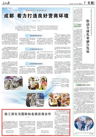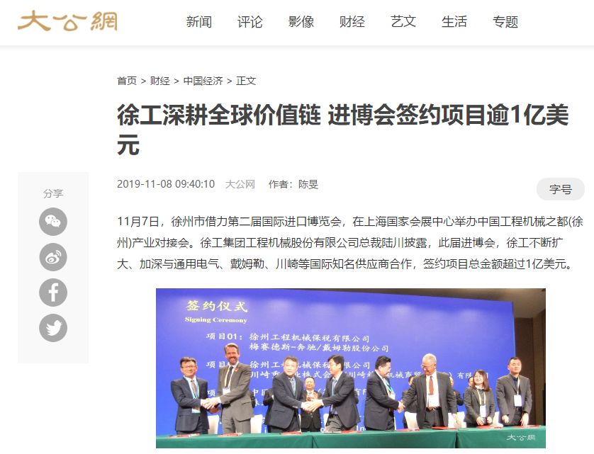 在第二届中国国际进口博览会上,徐工与通用电气、梅赛德斯奔驰、川崎等国际知名供应商进行深化合作签约仪式。近年来,徐工始终坚持“引进来”和“走出去”相结合,构建起与世界工程机械知名企业的合作桥梁,同时大力培育技术优势、推动创新发展,产品的国际市场竞争力持续提升。