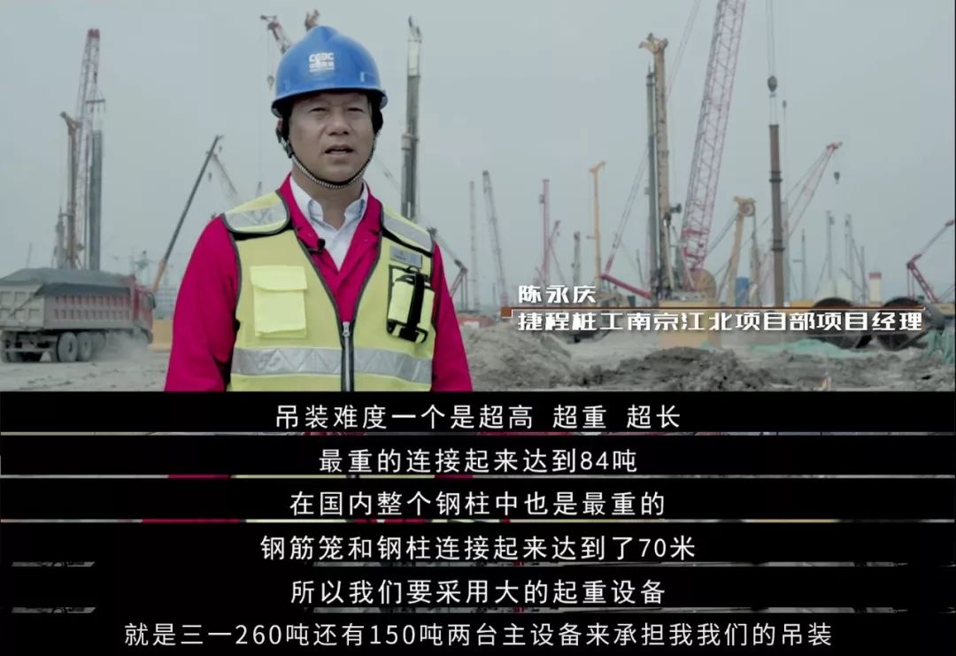 捷程桩工南京江北项目部项目经理陈永庆介绍:“吊装难度一个是超高,超重,超长,我们最重的连接起来达到84吨,在国内整个钢柱中也是最重的,钢筋笼和钢柱连接起来达到了70米,所以我们要采用大的起重设备,就是三一260吨还有150吨两台主设备,来承担我们的吊装。”