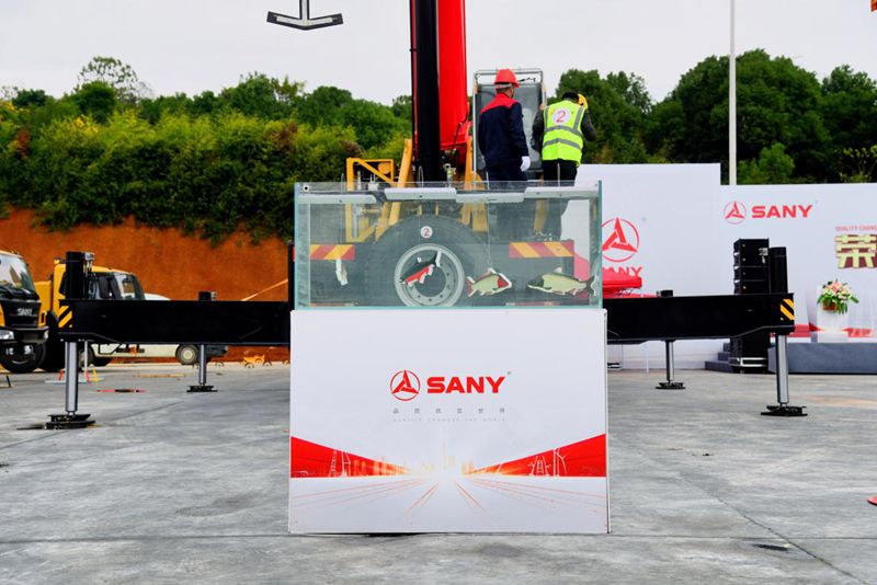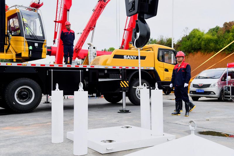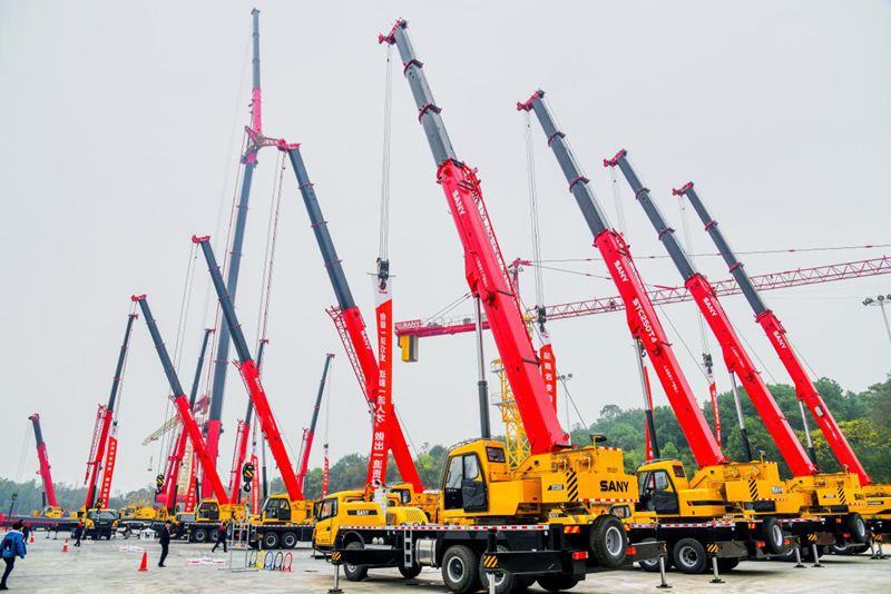 比赛现场,三一STC200T5、STC250T4、STC250C5、STC400T四台明星产品组成的设备方阵首先亮相。多辆起重机排成一排,竖起红色大臂,宛如擎天宝剑。