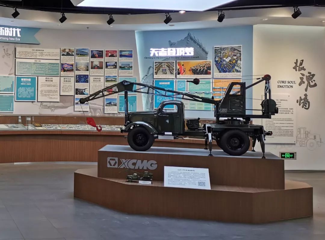 在徐工展厅内,摆放着一台军绿色涂装、钢架式吊臂结构的汽车起重机。