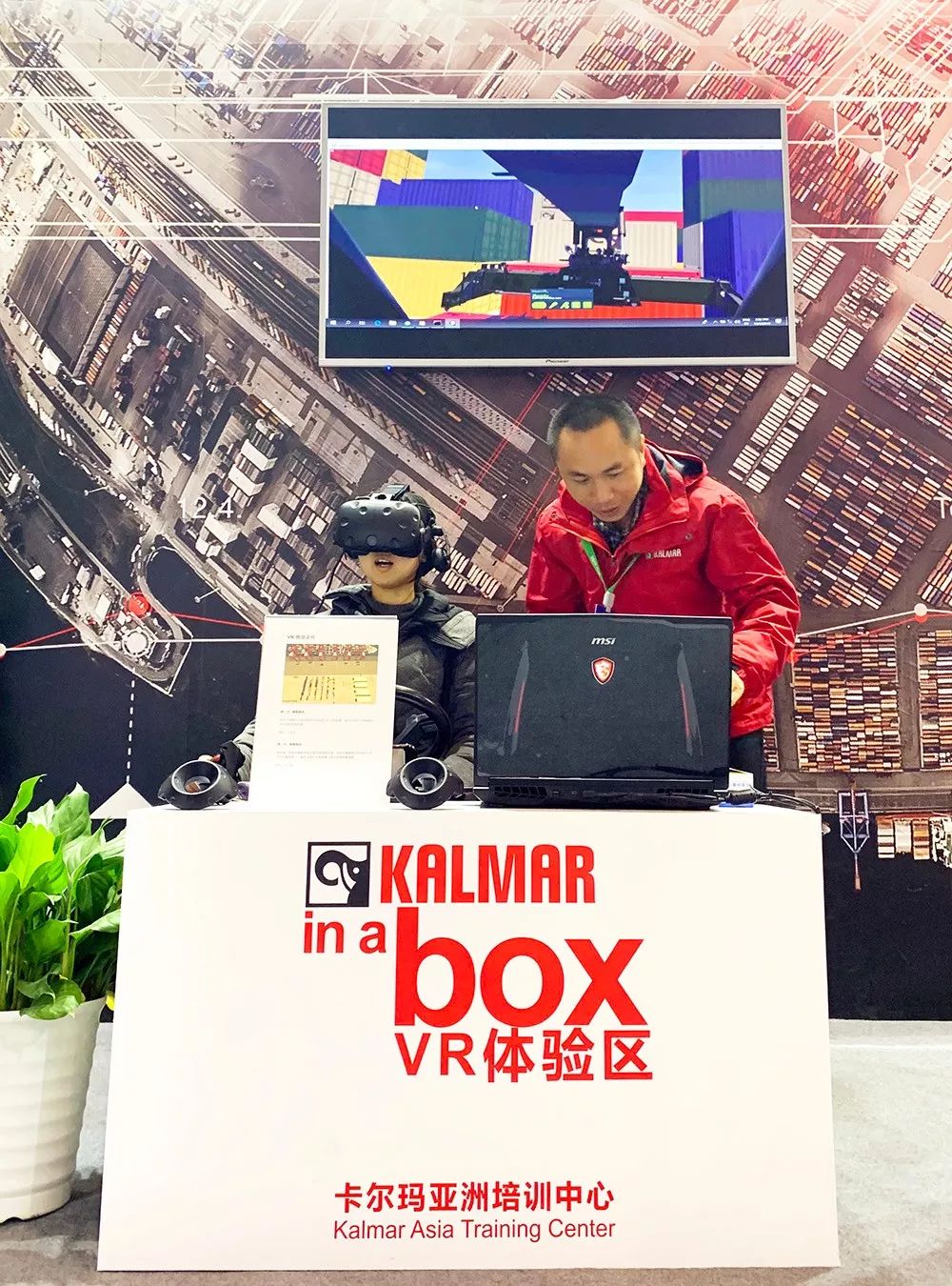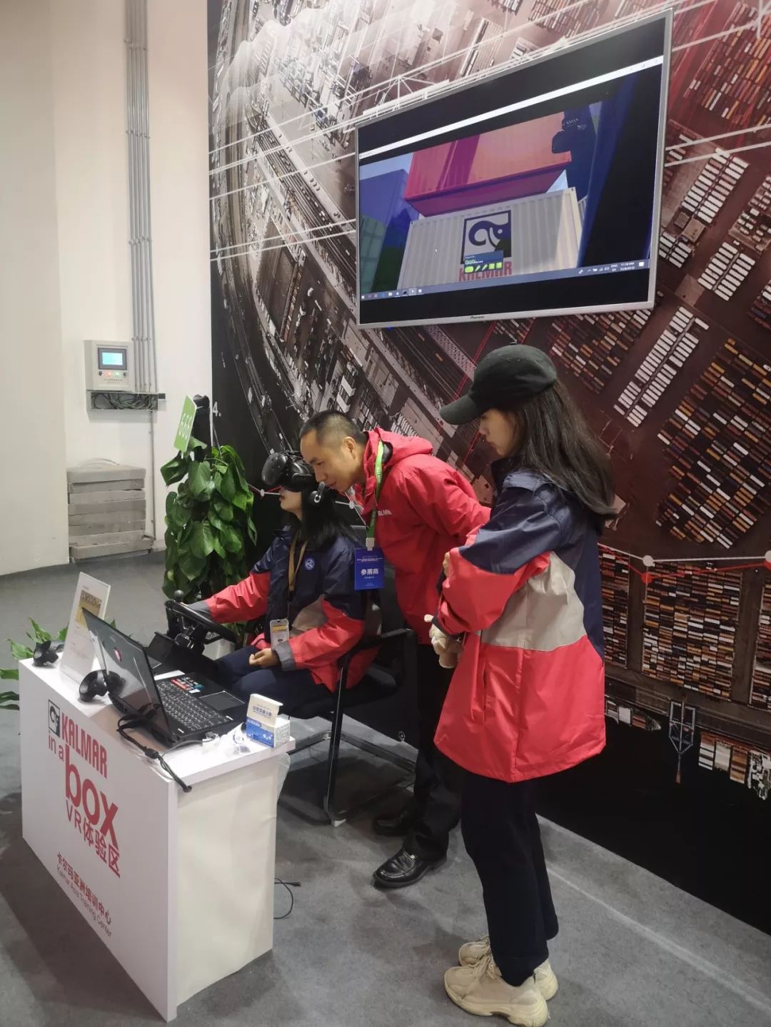 卡尔玛VR体验区吸引了众多小伙伴前来体验,戴上VR眼镜,即可沉浸式感受驾驶卡尔玛设备“搬箱子”的操纵感。
