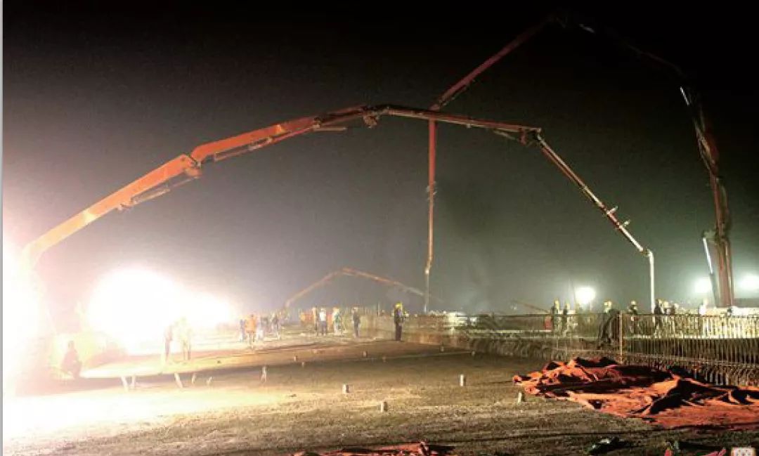 由于工期紧,施工方要求昼夜不停进行混凝土浇筑工作。超高的工作强度、超高标号的混凝土不断考验着三一设备稳定性与可靠性,也挑动着三一服务工程师的神经。一旦设备出现问题影响混凝土浇筑,客户将蒙受巨大损失。在此情形下,为确保混凝土浇筑工作万无一失,三一泵送安排专人浇筑期间24小时驻守现场,只为第一时间为客户解决问题。