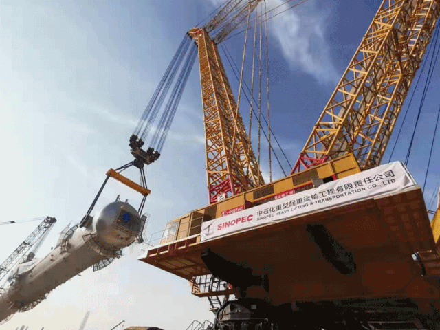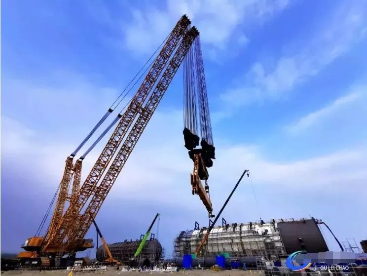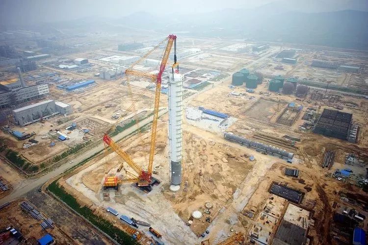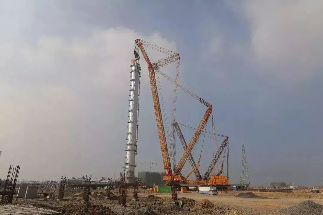 △乙烯塔塔起灯亮2019年6月20日“巨无霸”徐工XGC88000履带式起重机战袍加身联合500吨履带式起重机,将中科炼化大型设备——煤制氢装置吸收塔顺利吊装就位。所抬设备为煤制氢装置的第一高塔,也是该装置关键核心设备,直径4.8米,高约90米,抬吊总重800多吨。