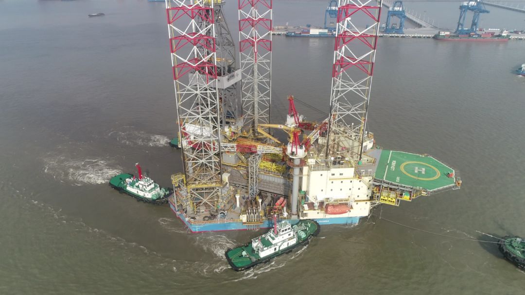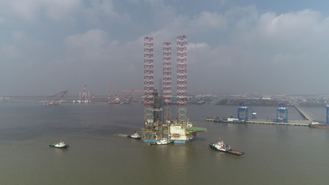 12月27日,由振华重工承建的高效钻井平台JU2000E自升式钻井平台 “振海五号”在常熟锚地起航发运。