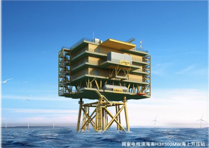 该风电场位于江苏省盐城市滨海县废黄河口至扁担港口之间的近海海域,拟配套建设一座220千伏升压变电站。该升压站上部组块采用五层布置,平面尺寸为38.1米×41.54米,最高点距平均海平面34.65米,安装总重量约3200吨,上部组块吊点之间间距为13米x20米。