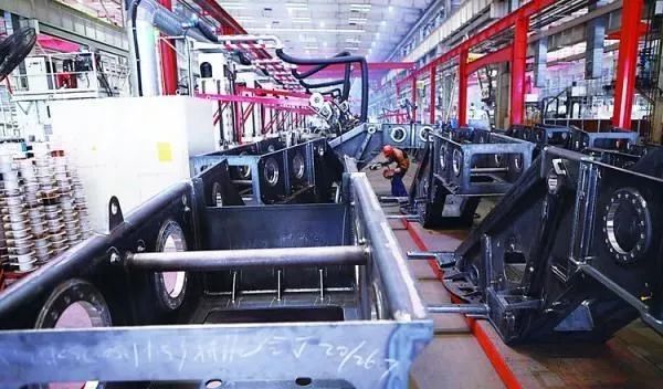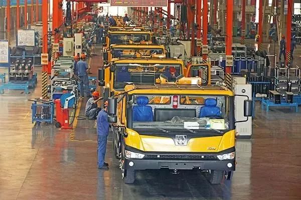 徐州城东,全球第一条工程起重机装备生产线坐落于此,220米长的底盘智能装配线仅有17个工位,平均每20分钟就可以装配一辆中小吨位的车载起重机。