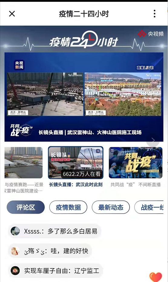 截至今日,火神山医院和雷神山医院的建设直播在线观看人数加起来已经超过6600万。颇为有趣的是,网友还为工地上的每一台设备起了昵称,其中三一重工56米混凝土泵车被亲切地称为‘大红’。