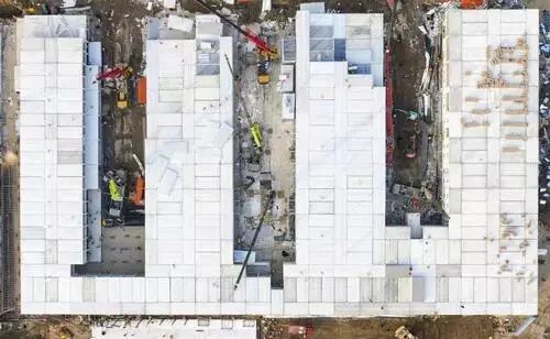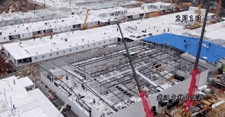 焦点二:10天建成怎么做到的?1月31日晚11时,当很多人开始进入梦乡时,戴着口罩的中建三局项目负责人李健依然站在火神山医院的施工工地上,指挥工人热火朝天地施工。按照规划,火神山医院2月2日建成,这意味着从1月23日进场施工到竣工,仅有10天的建设工期。相比之下,雷神山医院更是“神速”。1月26日正式开工,仅仅5天时间,总体建设进度已完成60%以上。“速度的背后,是我国建造技术的创新。”正在雷神山医院现场指挥的中建三局一公司党委书记吴红涛说,两个医院的建设采用了行业最前沿的装配式建筑技术,最大限度地采用拼装式工业化成品,大幅减少现场作业的工作量,节约了大量的时间。同时,在外部拼接过后进行整体吊装,将现场施工和整体吊装穿插进行,实现了效率最大化。