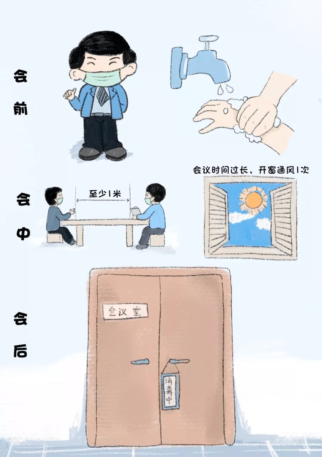 建议佩戴口罩,进入会议室前洗手消毒。开会人员间隔1米以上。减少集中开会,控制会议时间,会议时间过长时,开窗通风1次。会议结束后场地、家具须进行消毒。茶具用品建议开水浸泡消毒。