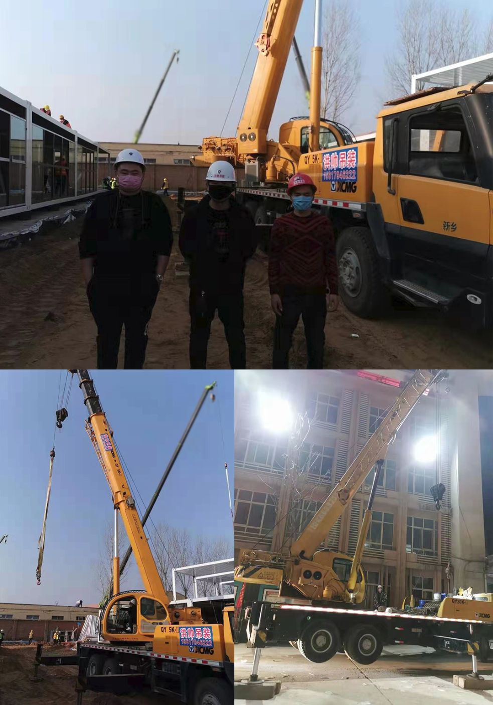 河南版“小汤山”效果图(来源:中国建筑第七工程局有限公司)“争当优秀党员,退伍不褪色!”郑州洪帅工程机械的负责人洪帅是名党员,也是退伍军人出身,平时到处跑工程,一年也就春节假期能陪陪家里人。在得知要建设河南“小汤山”医院的消息,他毫不犹豫地向施工方提交了自己的公司资质证明,并在上面写着“争当优秀党员,退伍不褪色”,主动请战加入医院的建设,他真诚地表示,“我没什么文化,但有一身的力气,时刻准备着大干一场!”于是,在年初四晚上,洪帅带着自己的团队携徐工QY25K5-I、QY25K-II两台起重机进场开始老房改造的施工,24小时不间断,在夜间阴冷潮湿的环境下也不停歇。
