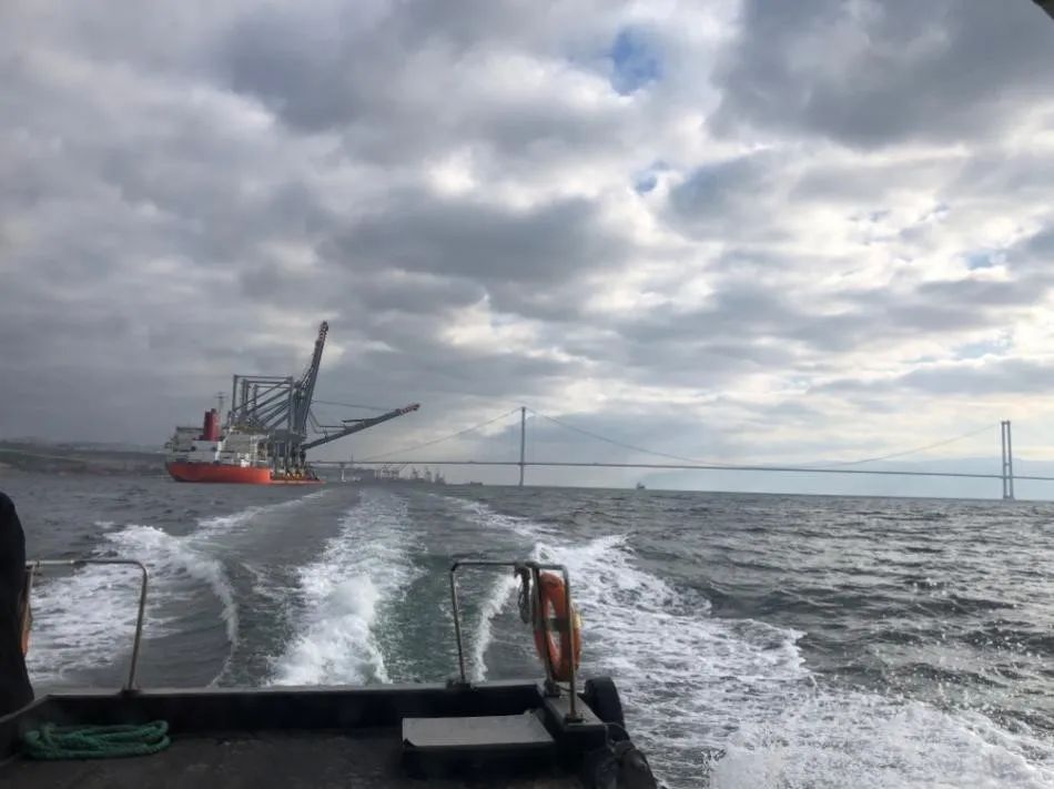 1月14日,“振华16”轮抵达土耳其过桥前的锚地抛锚,随后2台岸桥前大梁解除海绑并俯仰至高度低于立柱最高点。过桥前,“振华16”轮压载至最大吃水12米,经土耳其船级社现场实测确认整体高度低于60米限高要求,满足通航条件。1月21日早,“振华16”轮顺利通过了伊兹密特海湾大桥(IZIMIT)并靠泊用户码头。