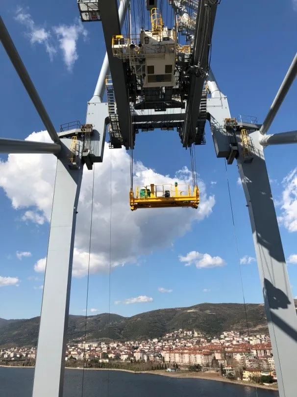 这2台岸桥是DP World Yarimca 的增订产品,轨上起升高度就达52米,而进港前需途径限高60米的伊兹密特海湾大桥(IZIMIT),常规的整机运输方式无法顺利通过。因此,振华重工在设计时就考虑了过桥难题,将岸桥的上部结构设计成π型结构,运输时将这部分结构放低后发运,岸桥抵达用户码头滚装上岸后再提升复位。