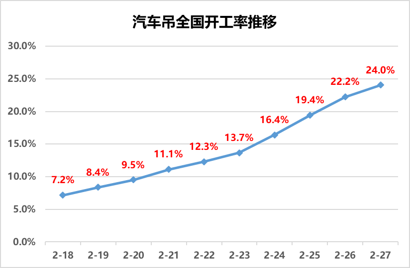 通过这些数据我们分析得知,全国范围内的汽车吊开工率显示出快速提升的势头。2月26日全国开工率是22.2%,2月27开工率持续上升为24.0%,但在一周前的2月18日这个数据只有区区7.2%。详细数据见下表: