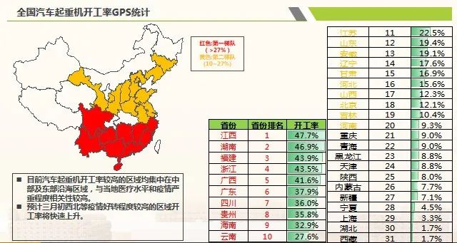 这是一组最新的可靠数据。通过对全国范围汽车吊的GPS数据进行跟踪,我们得以很清晰地观察出全国各地区的开工率(统计方法:对2020年2月全国有位置信息传输的汽车吊,当日工作时长≥2小时的机器计为开工)。