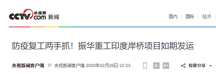 振华重工在2月10日复工复产。第二天,为荷兰鹿特丹港和德国汉堡港用户建造的4台岸桥,搭乘“振华26”轮就从长兴分公司码头起航发运。