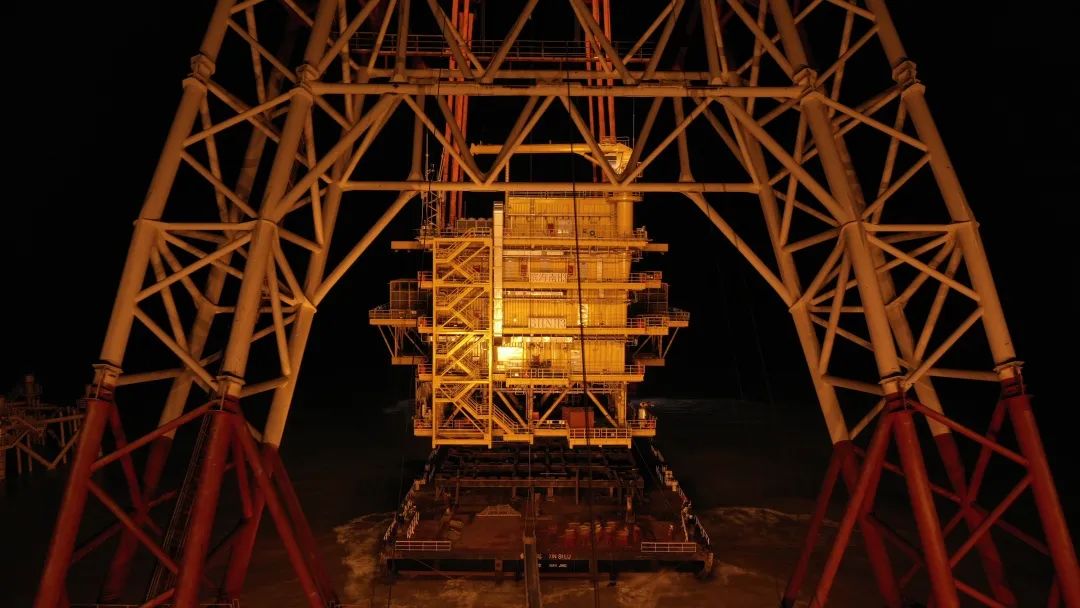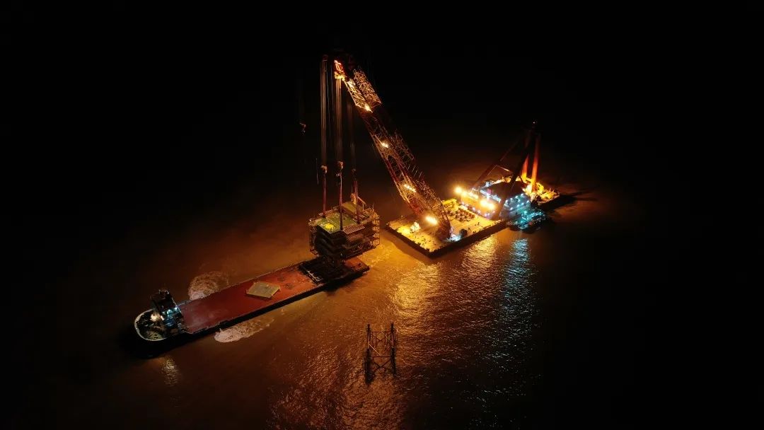 3月3日,经过近17个小时的紧张工作,振华重工“新振浮7”轮顺利完成国家电投滨海南H3#300兆瓦海上风电项目的“发电心脏”——220千伏海上升压站吊装。