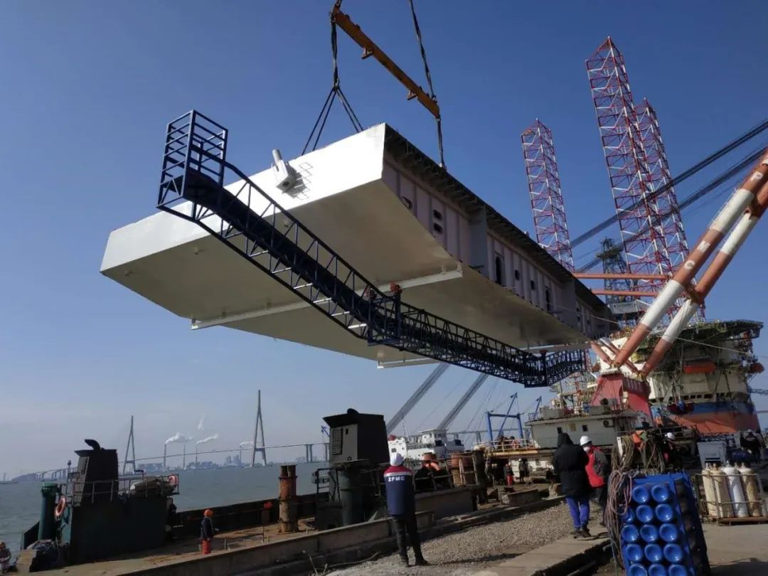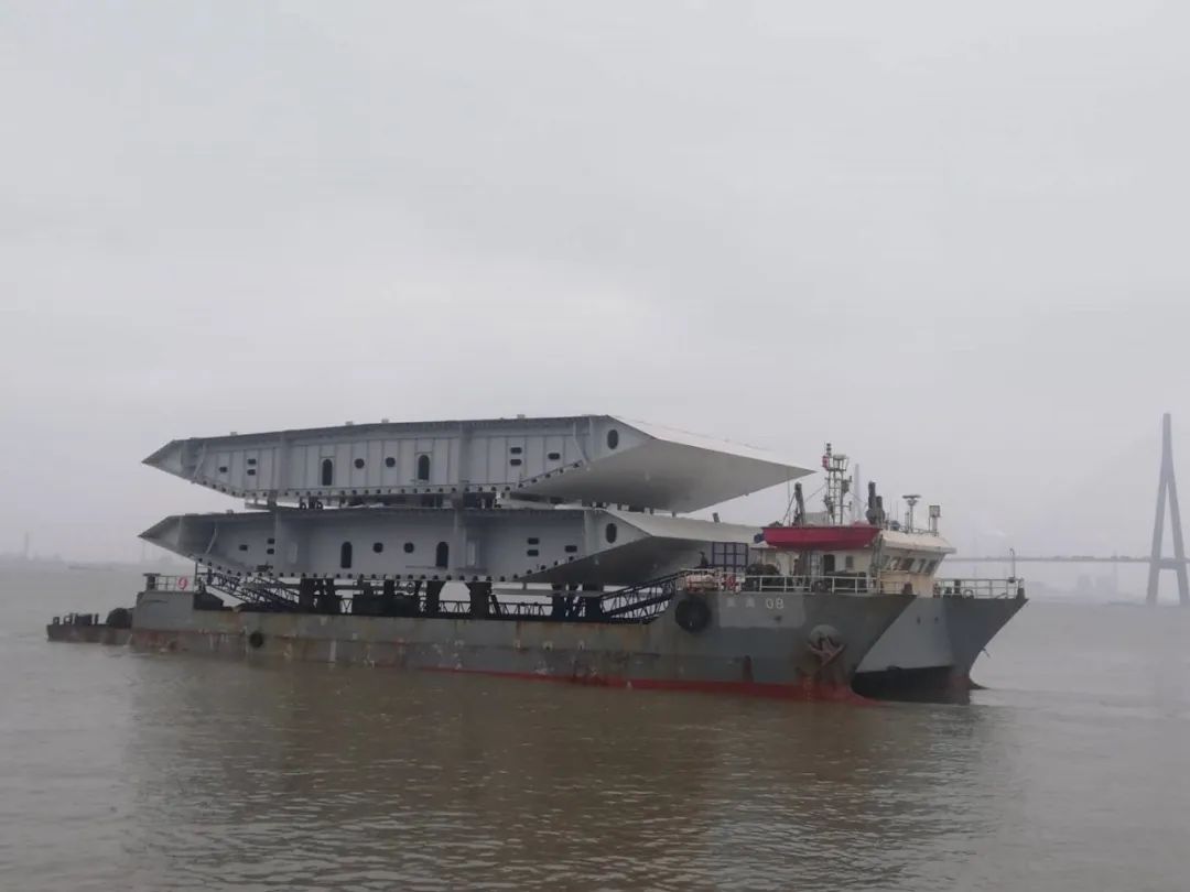 2月26日,奥海08运输船装载着舟山主通道NA3、BA4钢箱梁离开大南通基地码头,顺利起航。