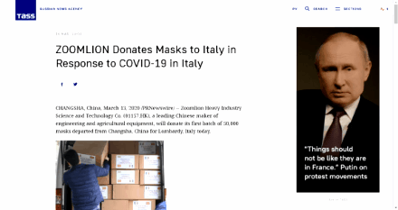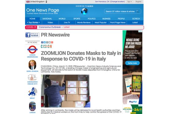 ▲海外多家知名权威媒体积极报道中联重科向意大利捐赠口罩