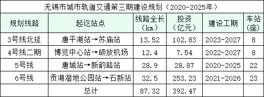 最新动态:3 月 16 日,无锡地铁官网发布《无锡市城市轨道交通第三期建设规划(2020-2025 年)及线网规划环境影响评价公众参与第二次公示》,包含 4 个建设项目,具体为 3 号线北延、4 号线二期、5 号线和 6 号线。总投资:392.47 亿元新增项目总规模:87.3km新建车站:60 座项目概况:无锡市城市轨道交通第三期建设规划规划年限确定为 2020-2025 年。新增项目总规模 87.3km,其中包含 3 号线北延、4 号线二期,共 25.9km 新线 5、6 号线,共 61.4km。新建车站 60 座。新建车辆段 2 处,停车场 3 处,主变电所 4 处。