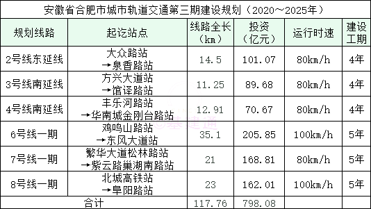 最新动态:3 月 26 日,安徽省合肥市城市轨道交通第三期建设规划(2020-2025 年)获国家发改委批复同意建设,具体包括 2 号线东延线、3 号线南延线、4 号线南延线、6 号线一期、7 号线一期、8 号线一期等 6 个项目。总投资:798.08 亿元总里程:109.96 公里