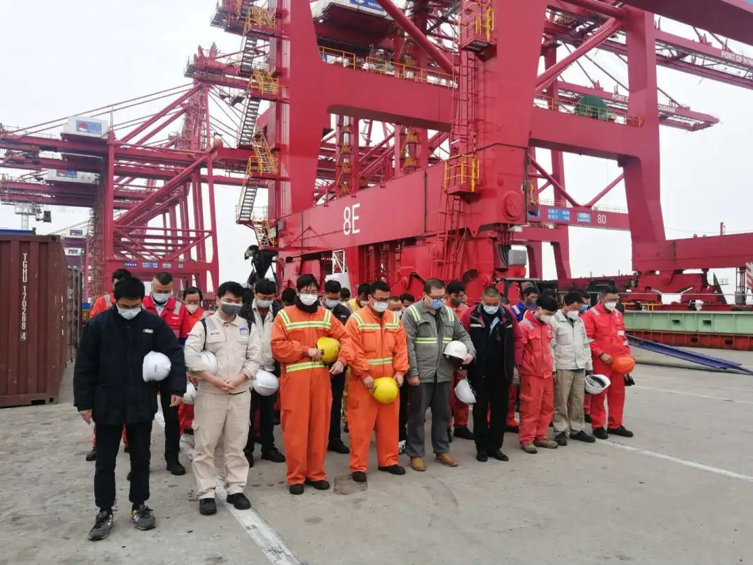 4月3日7点40分,“振华31”轮装载4台岸桥如期到岸。由于前期准备充分,在船停靠稳妥后,吊卸随船件、割除海邦件、铺设轨道等卸船工作便热火朝天地展开。现场分工明确,配合默契,在确保安全的前提下,一切工作有条不紊地快速进行。4月4日5点40分,随着高平潮的到来,第一台岸桥伴着旭日缓缓上岸。9点30分,设备顺利落轨。这一天是全国举行哀悼的日子,10点整,卸船现场全体人员停下手中的工作,共同向抗击新冠肺炎疫情斗争中的牺牲烈士和逝世同胞表示深切哀悼。