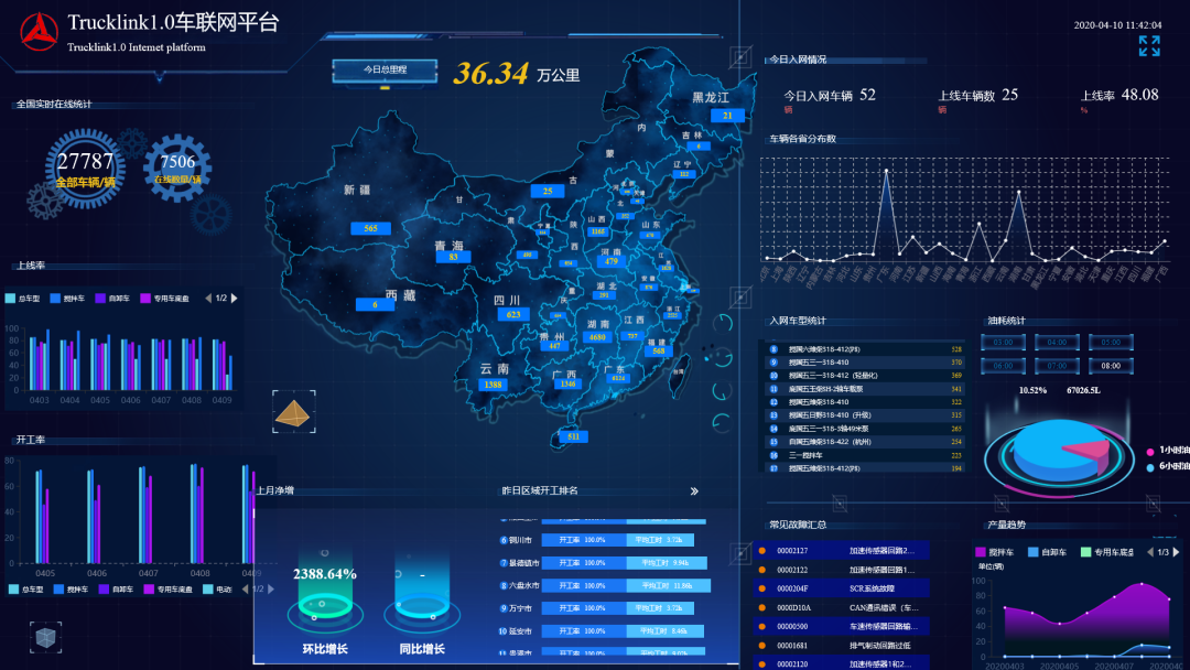 Trucklink车联网平台可进行底盘数据、泵送方量、泵送次数、泵送油耗等两百余种设备运行的关键数据,客户只需轻轻一点,即可查看设备的所有数据信息。