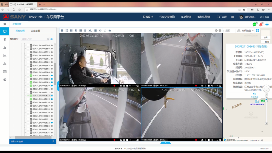 Trucklink车联网平台配备多个摄像头、传感器,可实现360°无死角设备监控。监控视频将通过高清中控大屏显示至电脑端进行在线监控,设备操作情况更清晰。