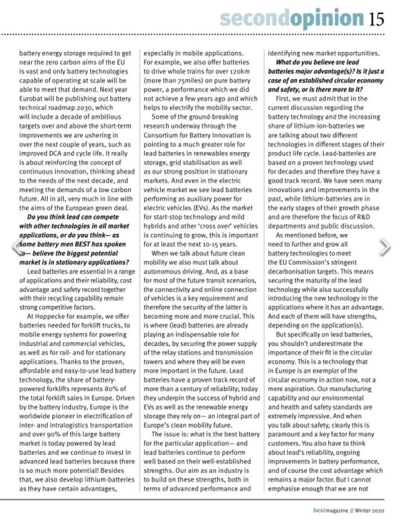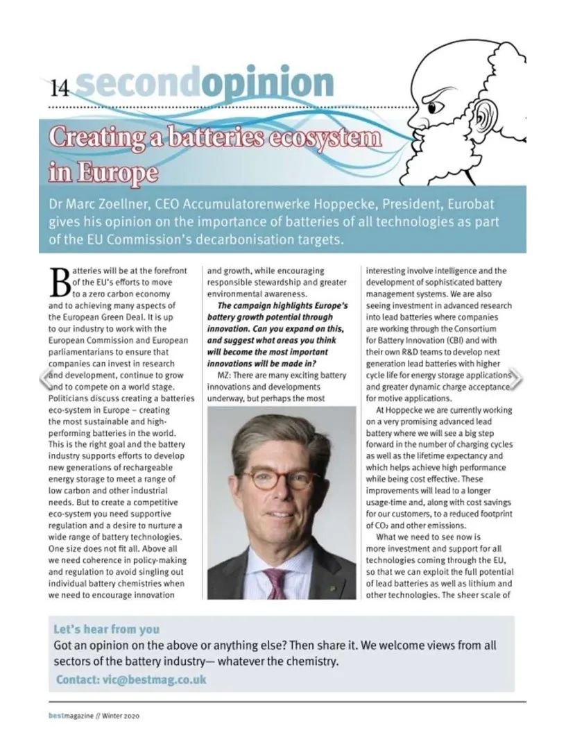 荷贝克集团总裁、EUROBAT主席,近日做客《BEST》(电池与储能技术),接受杂志人物专栏采访,对电池作为实现欧盟低碳减排目标的重要部分在各种技术应用中的重要性发表了自己的看法。