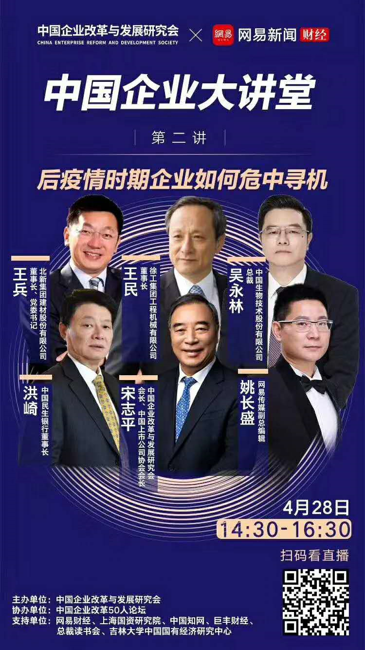 中国企业研究会会长、中国上市公司协会会长宋志平作主旨演讲,王民董事长与中国民生银行董事长洪崎、中国生物技术股份有限公司总裁吴永林、北新集团建材股份有限公司董事长王兵等企业家参加并作主题分享。本次活动由网易传媒副总编辑姚长盛主持。