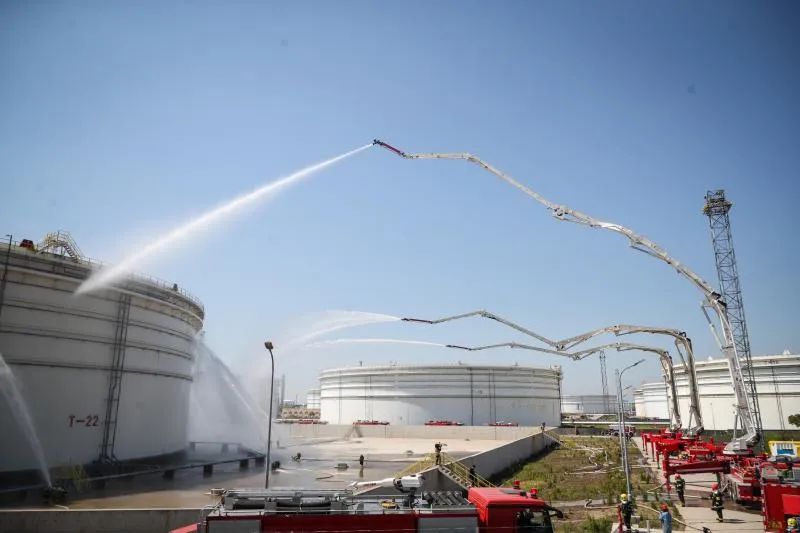 4月28日下午,上海市消防救援总队联合中国石化上海股份有限公司开展大型石油储罐火灾扑救实战拉动演练。演练假设中国石化上海股份有限公司原油储备罐区,一座10万立方米原油储罐因雷击导致密封圈起火,火势不断蔓延扩大,危及临近储罐安全。