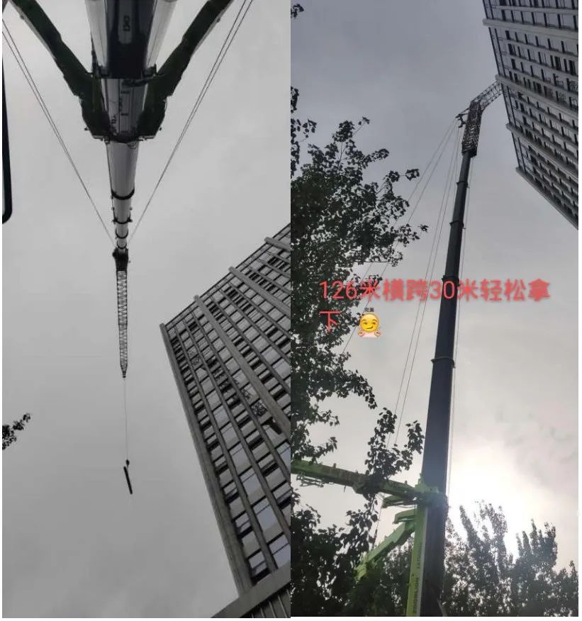 ▲许昌市老年大学主体楼项目目前城市中高层楼房大部分在30~33层,高度在100~110米,针对该类型建筑顶部作业及塔机拆装并无合适的机型及工况,市场上500吨级产品副臂工况高度勉强,但起重量低,且副臂无变角度工况,不能跨高层作业;塔臂工况高度够,起重量满足,但不能跨高层作业;更大吨位的产品工况可以满足要求,但对场地要求很高,效率低,而ZAT4000V副臂工况是专门针对城市高层建筑施工开发的。作为国内首创6桥400吨级全地面起重机,ZAT4000V具备极限吊重能力,适合桥梁、盾构等重型物件吊装。同时它也有着丰富的工况扩展:双钩协助盾构自翻身工况,60m无级变幅副臂等工况既满足桥梁、盾构重型构件吊装,又适用于风机检修、城建高空搬运。