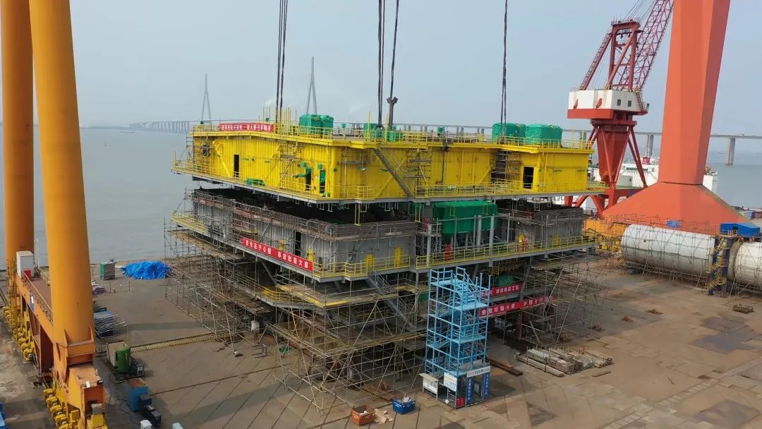 5月4日中午12时,经过近4小时的吊装作业,珠海金湾海上升压站上部模块平台成功合拢,标志着项目陆上主体钢结构建造工作顺利封顶收尾,后续将进入电气系统安装以及各专业大舾装、调试阶段。