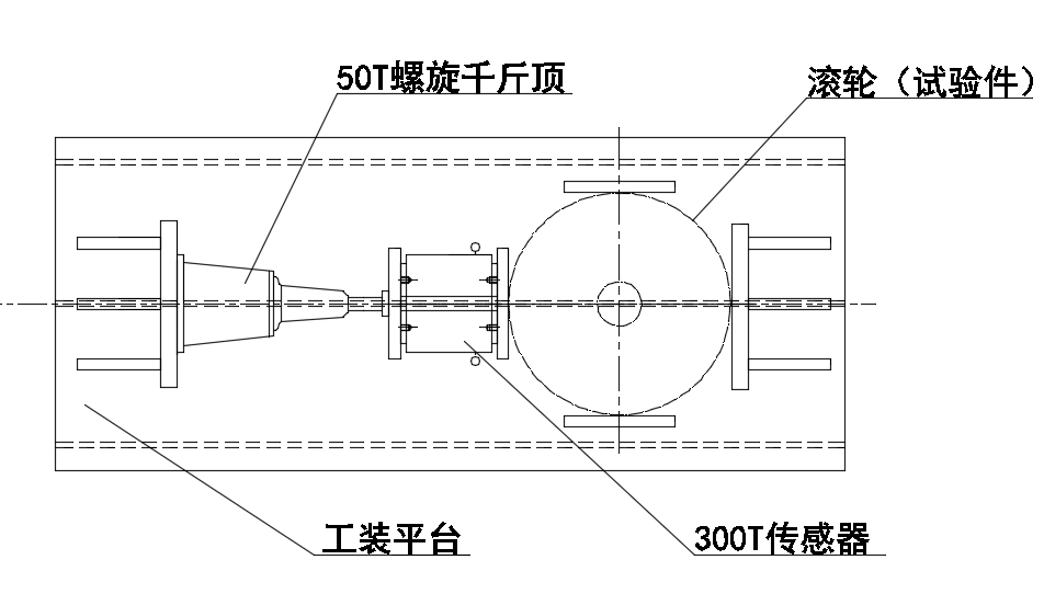采用比起重机小巧轻便的50吨螺旋千斤顶对滚轮施压,为试验人员留足测量空间;打造专门的工装配套,降低试验操作的难度,简化试验分工,将试验施工人数从6人减至2人;用工装将滚轮固定好后,再用千斤顶进行横向施压,避免滚轮颠覆移位;在千斤顶和滚轮之间放置能精确计重的传感器,确保精准施压。