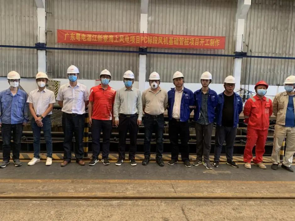粤电新寮海上风电项目约2.8万吨,首批桩计划6月份交付,制作时间不足45天,工期极为紧张,项目团队秉承 “一人走百步不如百人走一步”的团队精神,积极联系钢厂、设计院进行沟通协调,克服材料到货慢、工艺方案调整大等困难,为项目按期开工提供了有力保障。