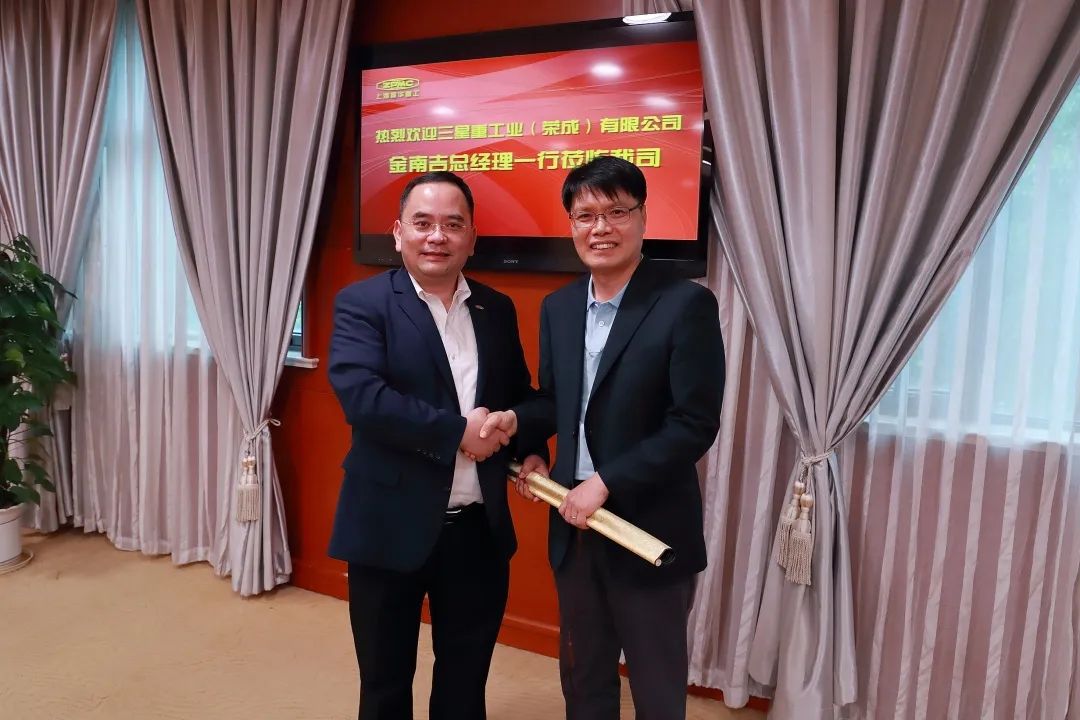 5月29日,振华重工总裁、党委副书记黄庆丰在公司总部会见了三星重工业(荣成)有限公司总经理金南吉。公司副总裁戴文凯参加会见。